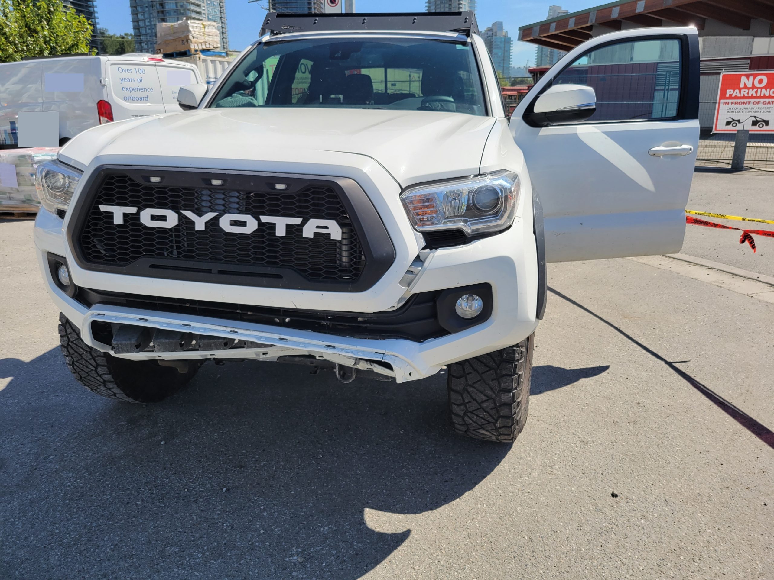 “Witnesses indicated a white Toyota Tacoma had crashed into a concrete block, which caused the block to strike another vehicle legally parked at the location. The pick-up truck then reversed and collided with a wooden pallet holding construction materials,” the Burnaby RCMP said.