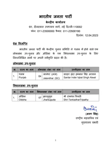 The BJP posted on its social media accounts a letter declaring Inder Iqbal as its candidate for the Jalandhar Lok Sabha by-election late Wednesday night.