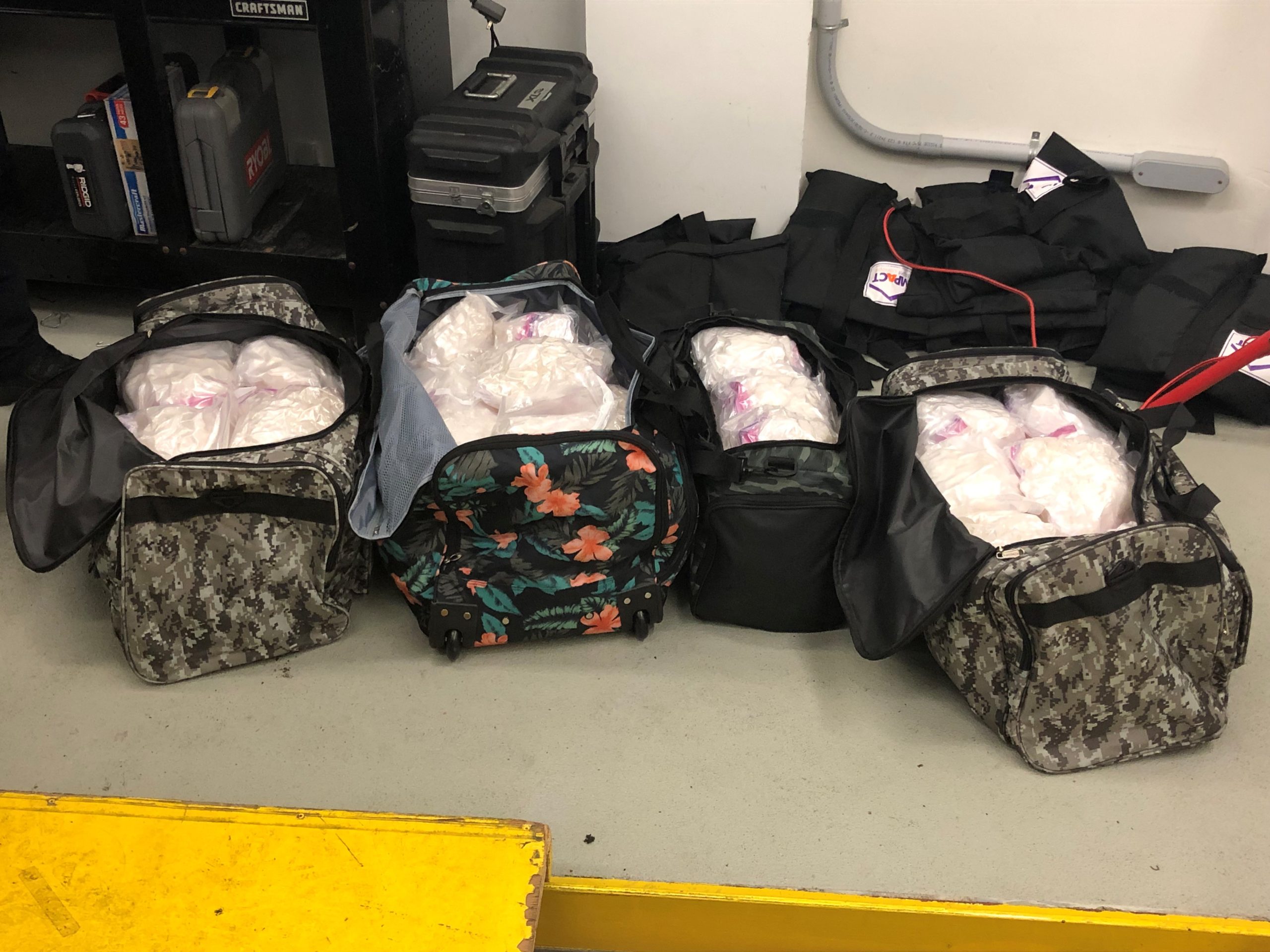 The CBSA alerted the RCMP and shortly afterwards, the vehicle was intercepted and the traveller was returned to the port of entry for further examination. Upon inspection of the traveller’s vehicle, border services officers found several large commercially sealed bags containing a white crystalline substance in the trunk. A CBSA detector dog indicated positive for narcotics and the traveller was subsequently arrested for fleeing the port of entry, and smuggling under the Customs Act.