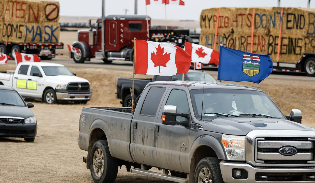 A convoy of commercial trucks, vehicles and camper vans has been blocking the highway at the Coutts border since Saturday to protest COVID-19 restrictions.